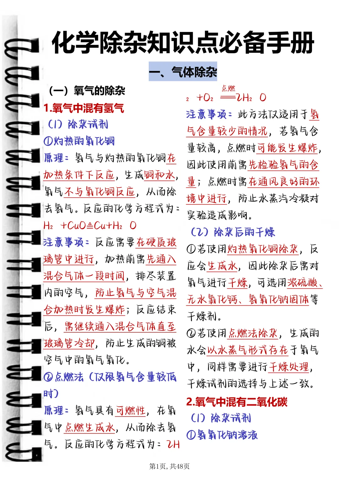 今天给大家整理了中考必备的【初中化学除杂知识点必备手册】,全面覆盖气体、液体、固体全类型常考除杂场景,每个除杂场景均附详细除杂试剂、反应原理、操作步骤与关键注意事项,不管题目如何变式,都能精准破题,轻松拿下高分!
