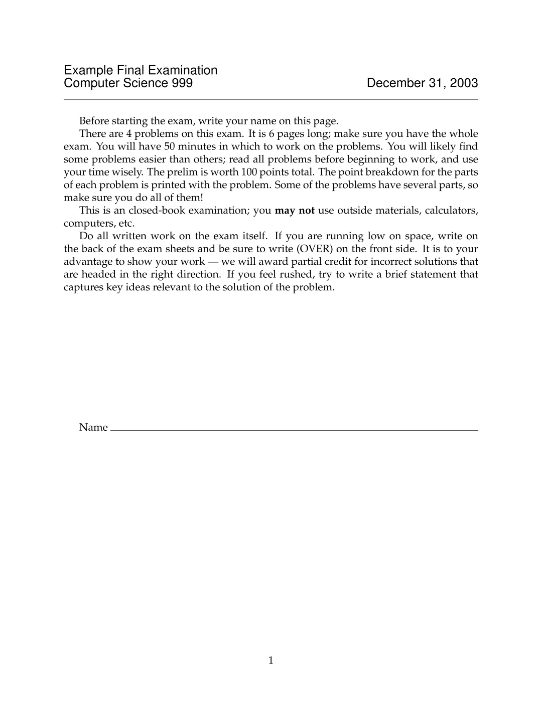 \documentclass[12pt]{ctexart}\usepackage[instructions]{exam}\title{CS 999 期中考试}\date{2024年10月31日}\begin{document}\maketitle\ifinstructions% 封面说明(仅学生版显示) 考试时间:120分钟 \par\scorebox% 评分表\fi\begin{questions}\question{算法分析}{25} 请分析以下代码的时间复杂度:\par\ans{8}{该算法时间复杂度为 $O(n \log n)$,因为...}\question{数据结构}{30}(\showparts)\begin{parts}\newpart{15} 解释哈希冲突...\newpart{15} 设计一个 LRU 缓存...\end{parts}\end{questions}\label{lastpage}\end{document}