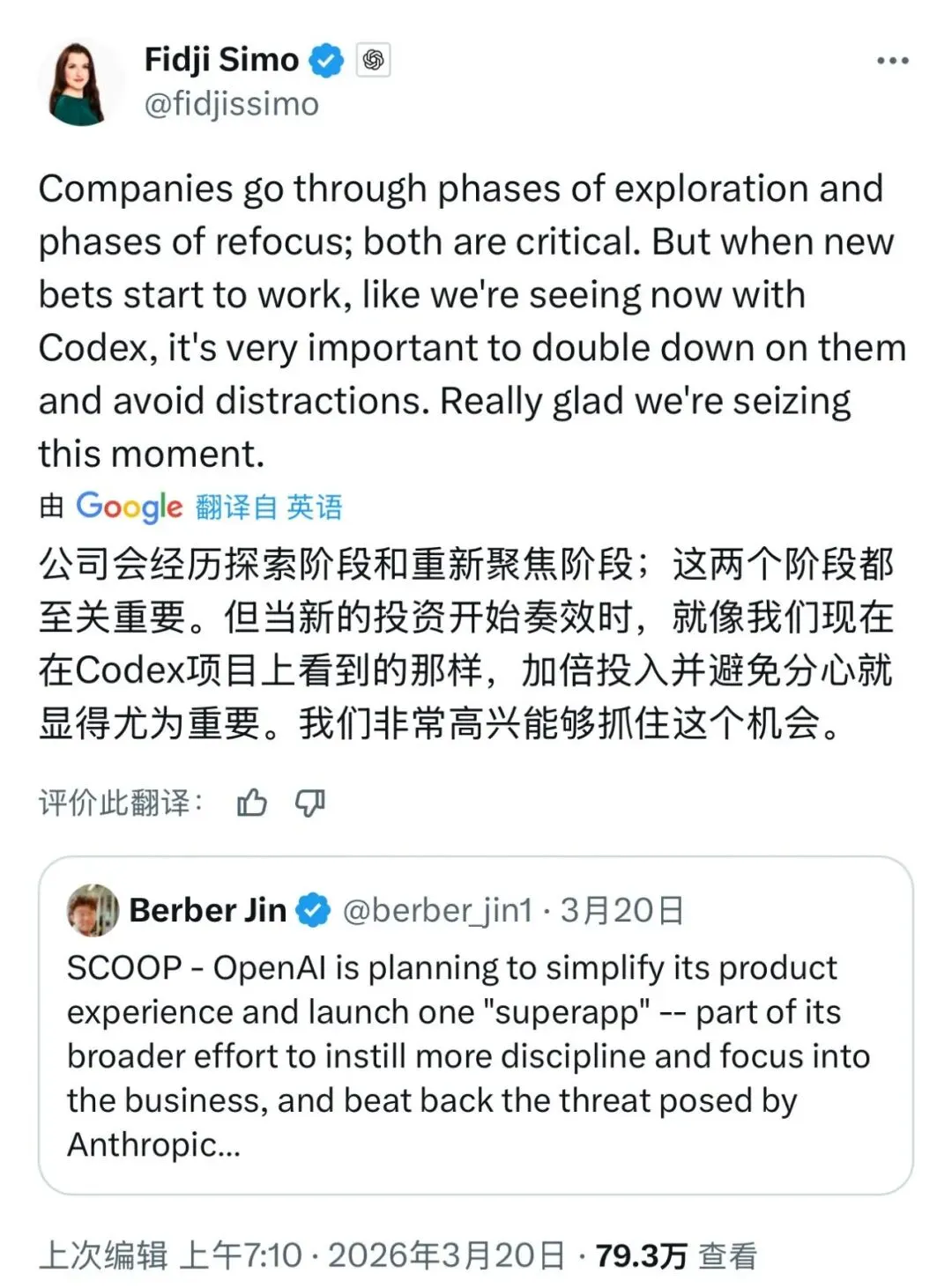 Simo在个人X账号发文表示:“企业都会经历探索期与聚焦期,两者都不可或缺。但当新的押注开始奏效——就像我们现在看到Codex的表现——就必须加倍投入,避免分心。很高兴我们抓住了这个时机。”