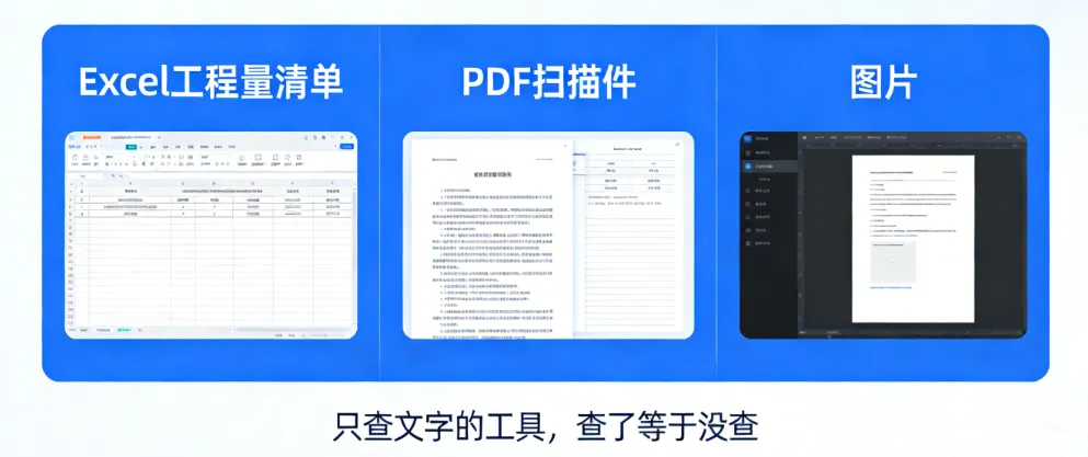 标书不只是文字。Excel工程量清单、PDF扫描件、图片——这些都得能查。 只查文字的工具,查了等于没查。