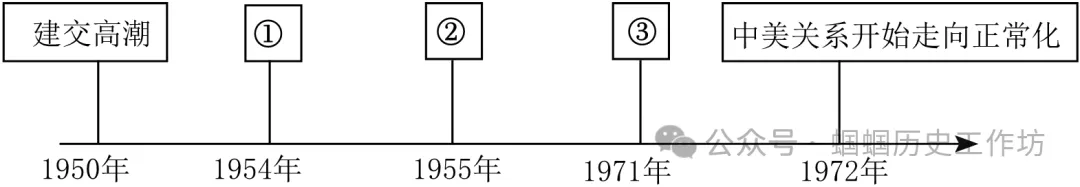 (1)新中国的外交成就;①:日内瓦会议;②:万隆会议;③:恢复联合国的合法席位。