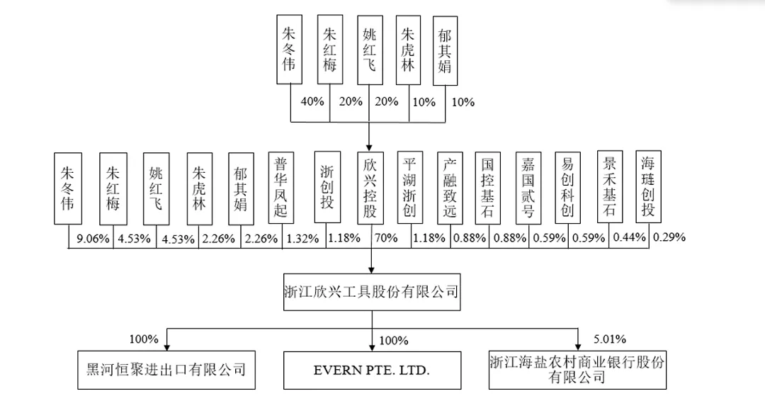 股权结构方面,朱冬伟、朱红梅、姚红飞、朱虎林、郁其娟共同为欣兴工具实际控制人,合计控制该公司92.65%的股份。其中,朱虎林与朱冬伟为父子关系,朱虎林与朱红梅为父女关系,朱冬伟与朱红梅为兄妹关系,朱冬伟与郁其娟为夫妻关系,姚红飞与朱红梅为夫妻关系。
