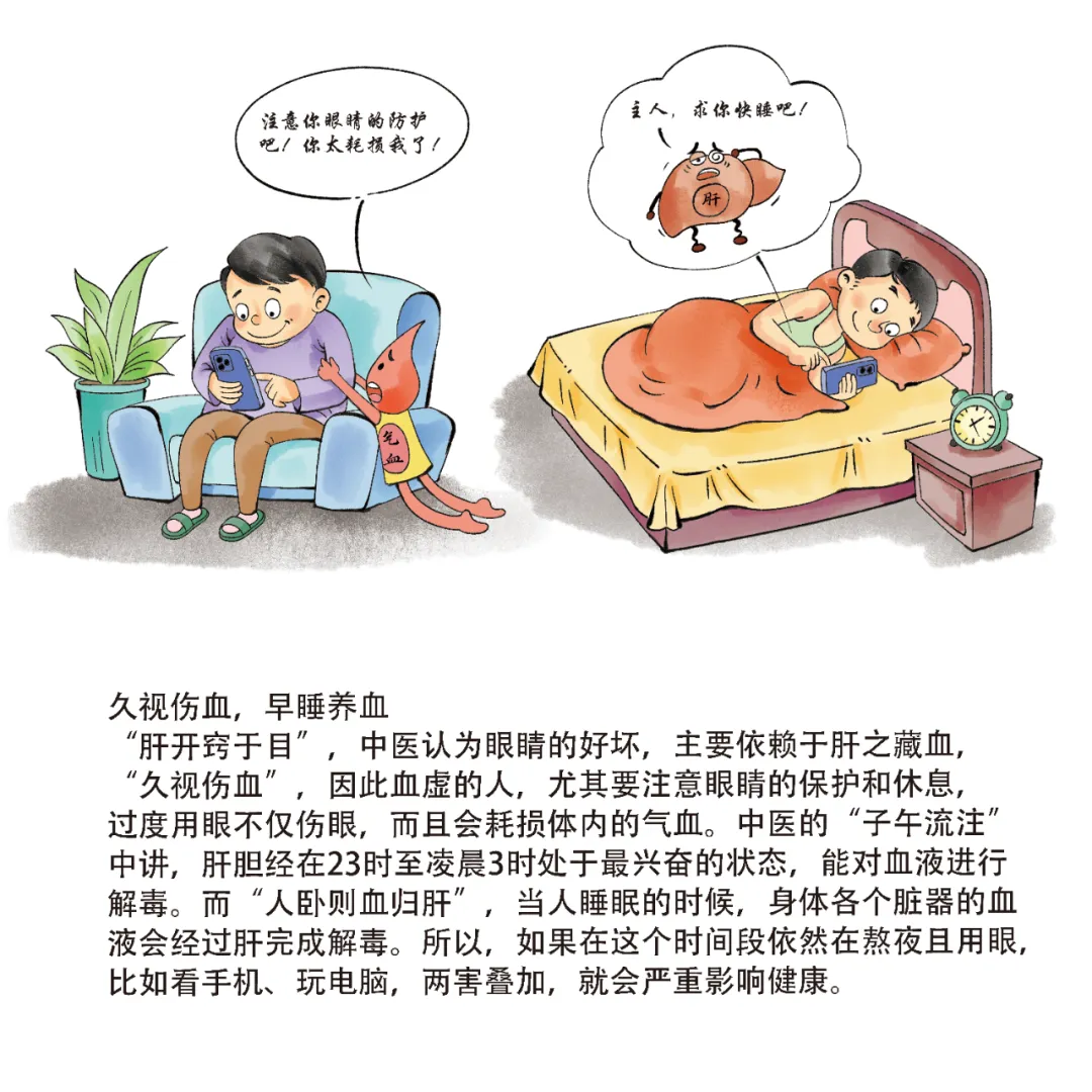 “肝开窍于目”,中医认为眼睛的好坏,主要依赖于肝之藏血,“久视伤血”,因此血虚的人,尤其要注意眼睛的保护和休息,过度用眼不仅伤眼,而且会耗损体内的气血。中医的“子午流注”中讲,肝胆经在23时至凌晨3时处于最兴奋的状态,能对血液进行解毒。而“人卧则血归肝”,当人睡眠的时候,身体各个脏器的血液会经过肝完成解毒。所以,如果在这个时间段依然在熬夜且用眼,比如看手机、玩电脑,两害叠加,就会严重影响健康。