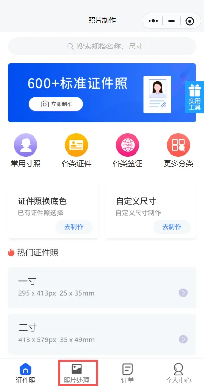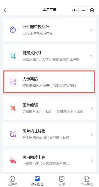 第一步:打开小程序在微信里搜索【照片制作】小程序,进入后点击“照片处理”找到”人像高清”功能。