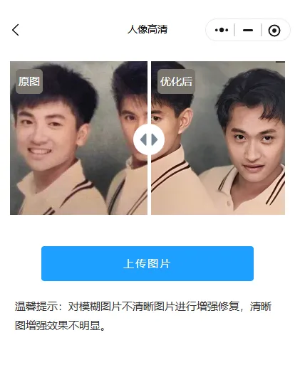 第二步:上传照片选择你想要修复的人像模糊照片。这里有个小建议:尽量选择原图上传,且要有人像,效果会更好。