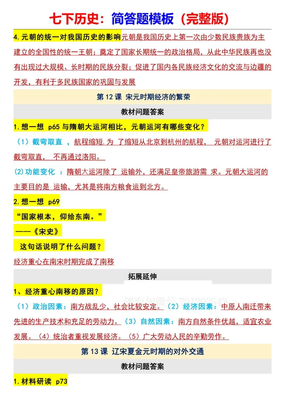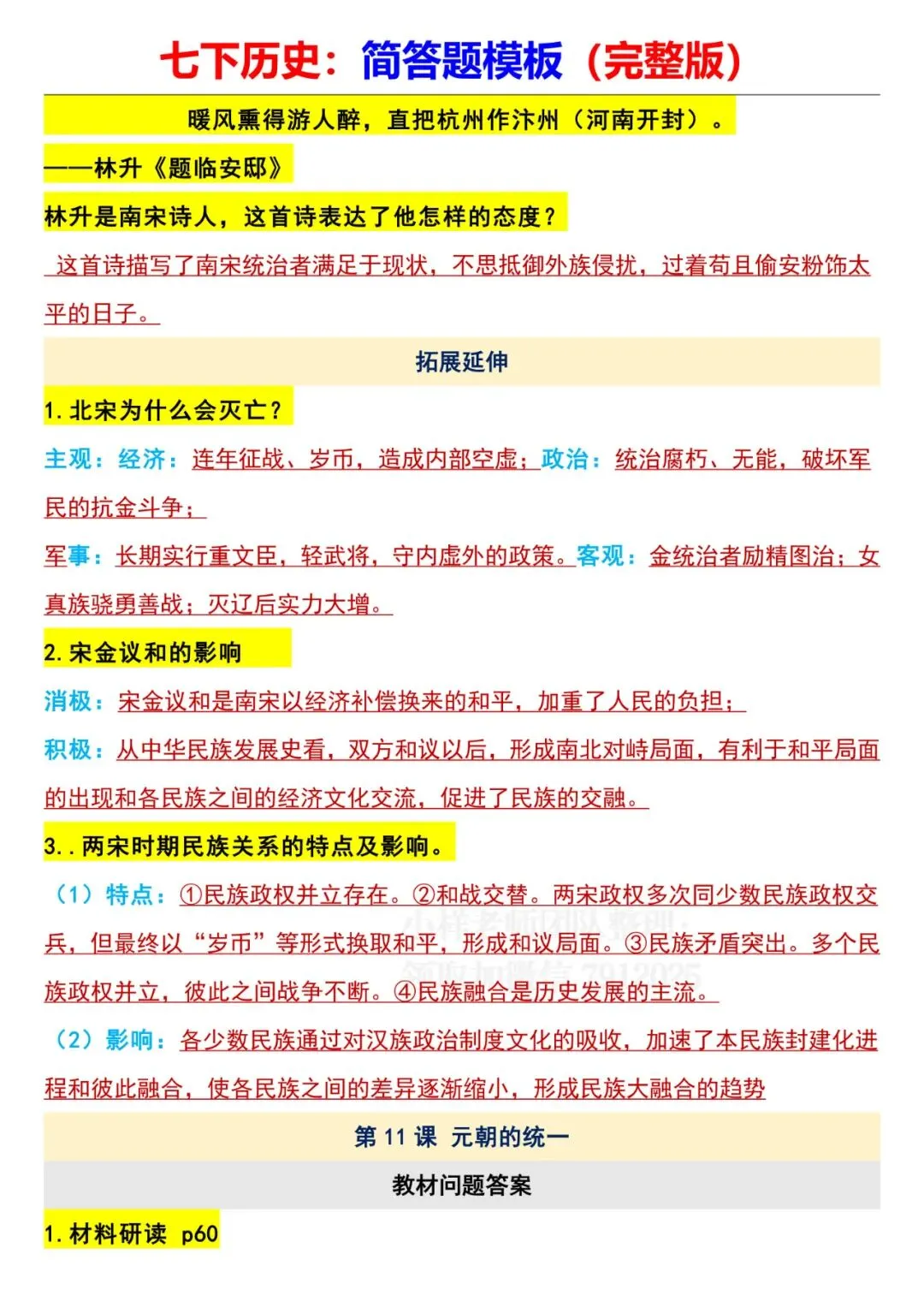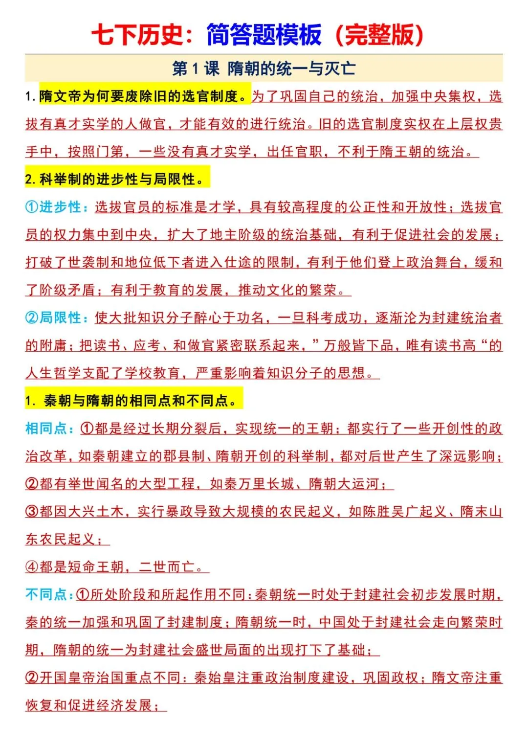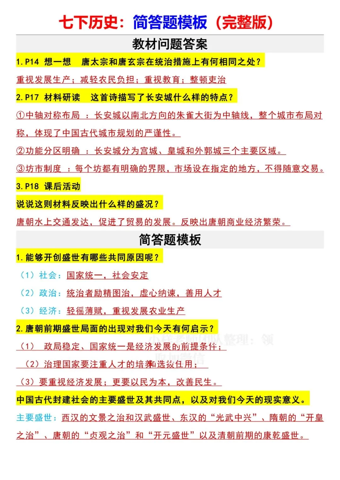 今日老师为大家整理了:七年级下册历史全册简答题模板电子版可打印