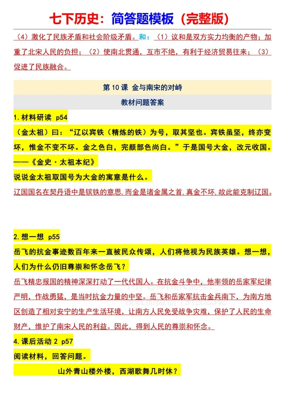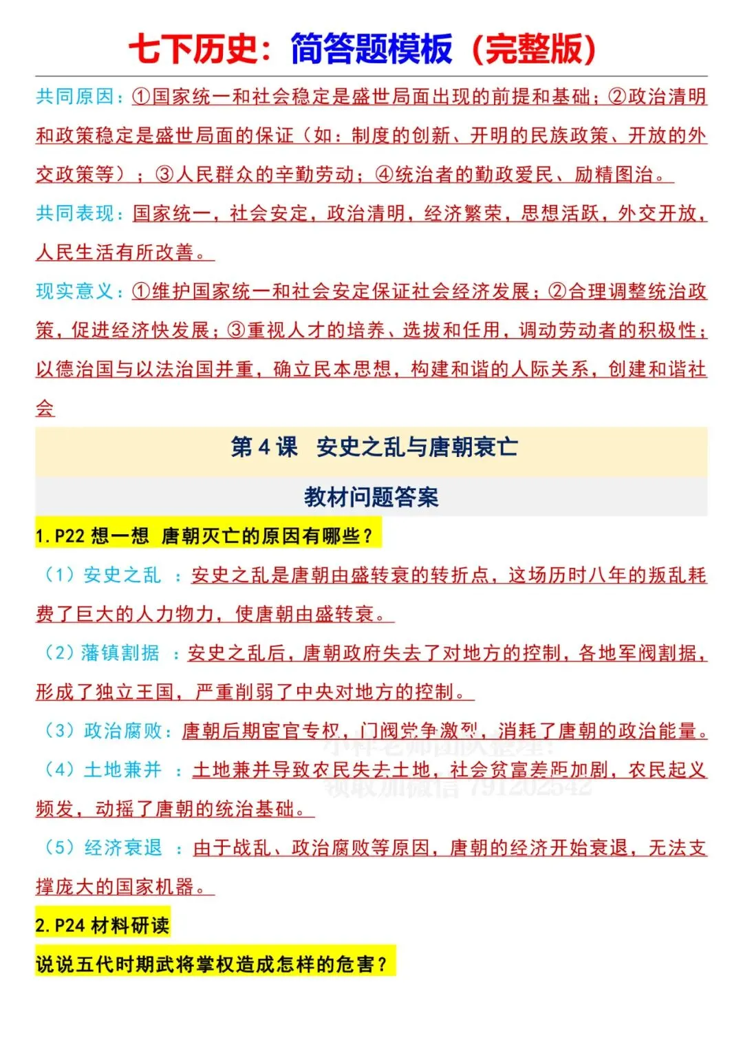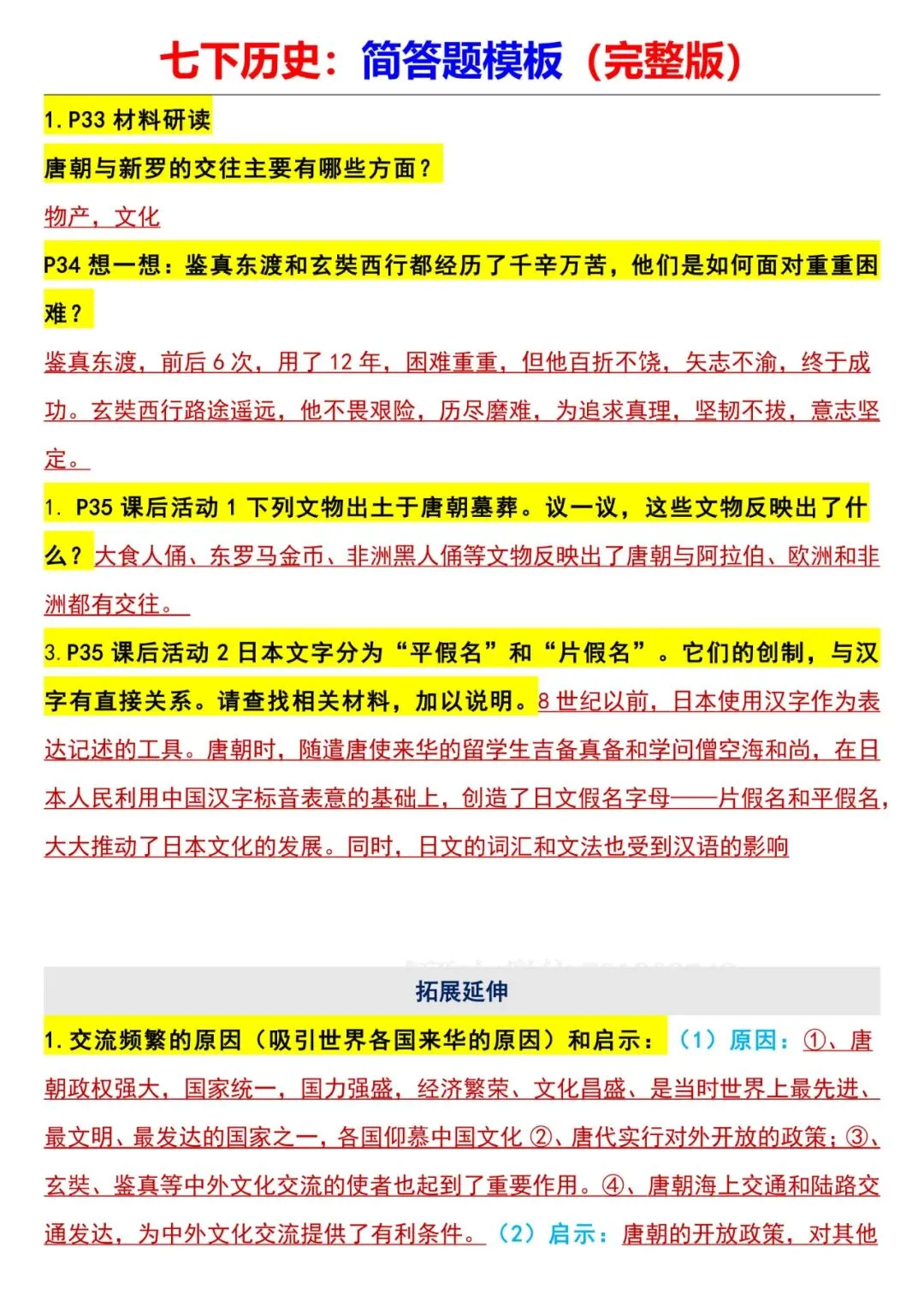 七年级下册历史全册简答题模板电子版可打印