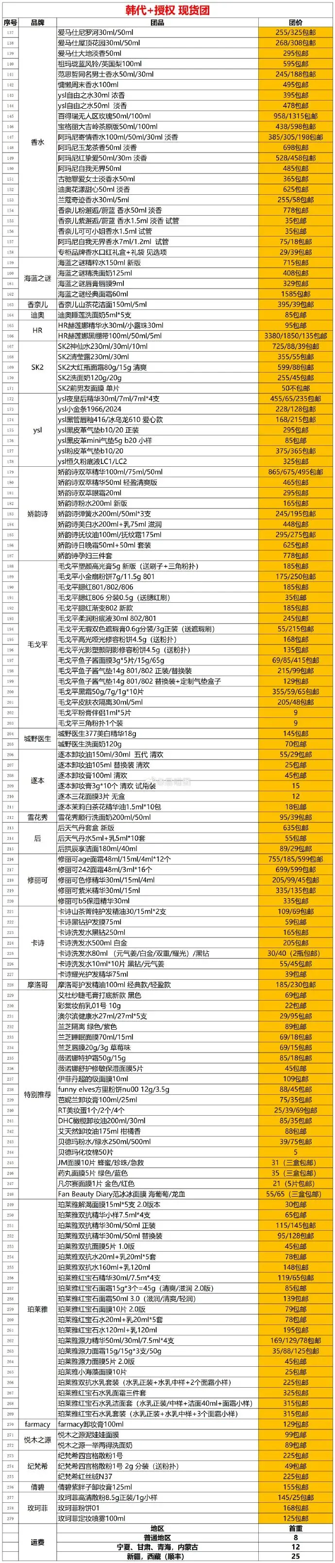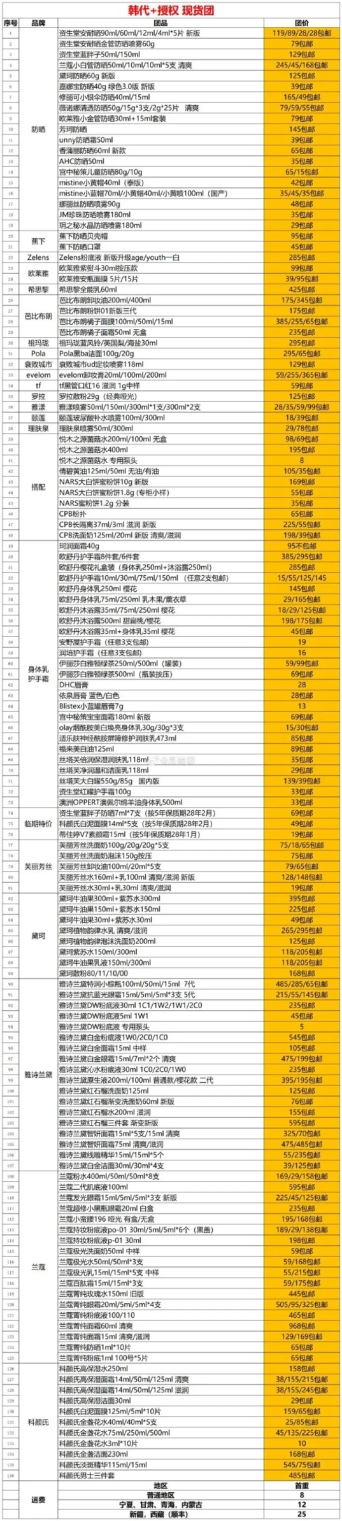 超全面的韩代它来啦!兰蔻 科颜氏 毛戈平 植村秀 阿玛尼 芭比布朗 雅诗兰黛 娇韵诗 雪花秀 城野医生 玫珂菲 珂润 馥蕾诗 怡丽丝尔 雅顿等,大牌平价款特别全,无论你是什么肤质,都能找到适合自己的,而且咱们团价非常划算,需要的姐妹别错过!俗话说得好,防晒做得好,才能不显老!一年四季每天都要涂,日常芳珂 怡思丁 蓝胖子 兰蔻小白管 黛珂,去海边 旅行爬山 度假啥的安耐晒是必备了!雅诗兰黛小棕瓶无论干皮还是油皮姐妹都很友好,特别滋润但是不会油腻,脸蛋子会软软嫩嫩,我夏天都在用,趁着团可以囤起来了!DW 兰蔻持妆粉底液适合油皮姐妹,上脸不厚重,定好妆出门一整天没在怕!沁水 植村秀小方瓶干皮姐妹用没错了,流动性非常好,上妆轻薄不易卡,预算足的姐妹就选白金,妆感巨好!还有眼影 洗面奶 发膜 身体乳 护手霜 腮红 流金水 菌菇水 气垫等 各种口红面膜和喷雾,需要别错过!!以下团品:Zelens粉底液,欧莱雅紫熨斗眼霜,evelom卸妆膏,怡丽丝尔眼霜,欧舒丹护手霜,欧舒丹身体乳,欧舒丹沐浴露,珂润面霜,mac绝绝紫散粉,资生堂红罐护手霜,安野屋护手霜,澳佩尔身体乳,雅顿绿茶,芙丽芳丝洗面奶,芙丽芳丝水乳,芙丽芳丝卸妆油,菌菇水,倩碧黄油,高保湿面霜,NARS蜜粉饼,CPB粉扑,Pola黑ba洁面,Pola黑ba眼霜,希思黎全能乳,芭比布朗卸妆油,芭比布朗橘子面霜,衰败城市定妆喷雾,牛郎眼影,欧缇丽喷雾,雅漾喷雾,安耐晒,资生堂蓝胖子,兰蔻小白管防晒,黛珂防晒,嘉娜宝防晒,芳珂防晒,修丽可小银伞防晒,unny防晒霜,香蒲丽防晒,AHC防晒,mistine小蓝帽,mistine小黄喷,娜丽丝防晒喷雾,薇诺娜清透防晒,蕉下口罩,黛珂牛油果紫苏水,黛珂植物韵律水乳,黛珂植物韵律泡沫洗面奶,黛珂散粉,雅诗兰黛小棕瓶,抗蓝光眼霜,DW粉底液,沁水粉底液,原生液,雅诗兰黛粉水,红石榴水,红石榴三件套,智妍面霜,兰蔻粉水,兰蔻奇迹香水,兰蔻二代肌底液,兰蔻发光眼霜,兰蔻持妆粉底液,兰蔻极光洗面奶,兰蔻极光水,兰蔻极光乳,兰蔻百肽霜,兰蔻菁纯眼霜,兰蔻菁纯粉底液,兰蔻菁纯玫瑰,兰蔻菁纯面霜,科颜氏高保湿水乳,科颜氏白泥面膜,科颜氏金盏花水,科颜氏金盏洁面,科颜氏淡斑精华,毛戈平塑颜高光膏,毛戈平腮红,毛戈平柔润粉底液,毛戈平无瑕双色遮瑕,毛戈平单色遮瑕膏,毛戈平高光哑光修容粉饼,毛戈平鱼子酱面膜,毛戈平鱼子酱气垫,小金扇粉饼,城野医生377精华,城野医生收敛水,逐本卸妆油,逐本卸妆膏,逐本面膜,后天气丹套盒,修丽可age面霜,修丽可色修精华,修丽色紫米精华,修丽可242面霜,修丽可b5精华,卡诗护发精油,卡诗洗发水,艾杜纱,贝德玛粉水蓝水,欧莱雅安瓶面膜,JM面膜,药丸面膜 ,farmacy卸妆膏,悦木之源祛痘凝胶,悦木之源一举两得洁面,泥娃娃面膜,倩碧紫胖子卸妆膏,倩碧镭射精华,玫珂菲高清散粉,玫珂菲粉饼,玫珂菲定妆喷雾,suqqu苏酷粉霜,ipsa流金水,清莹露,神仙水,大红瓶面霜,SK2面膜,娇兰复原蜜,娇兰蜂姿水,悦薇水乳,资生堂红腰子,资生堂发膜红色,馥蕾诗红茶水,馥蕾诗红茶白黑罐、红茶面膜,大豆洁面,珂润化妆水乳,珂润泡沫洗面奶,珂润去角质,娇韵诗双萃精华,双萃眼霜,娇韵诗粉水,娇韵诗弹簧水,娇韵诗弹簧日晚霜,nyx16色眼影盘,3ce眼影盘,阿玛尼粉底液,阿玛尼405,阿玛尼黑曜石,阿玛尼气垫,碧欧泉男士水动力,植村秀小方瓶粉底液,植村秀琥珀卸妆油,阿玛尼权利蓝标粉底液,雅顿金胶,雅顿粉胶,Mac小金盘,NARS超方瓶,olay小白瓶,ysl小金条,自由水,芝芙莲清洗液,柚子卸妆啫喱,AHC水乳,AHC洗面奶,ahc面膜,理肤泉面膜,理肤泉修复霜,棉花糖粉扑,一飞冲天睫毛夹,复活草面膜,女神洗面奶,kt土豆泥卸妆膏,N4面霜,歌剧魅影遮瑕盘,DMC欣兰冻膜,RCMA散粉,skindinavia定妆喷雾,尤妮佳化妆棉,水杨酸棉片,小蓝罐唇膏,RNW洗面奶,RNW鼻贴,尔木萄散粉,尔木萄洗脸巾,尔木萄美妆蛋,尔木萄粉扑,春雨面膜,大创清洁剂,小林清洗剂,kissme眼线笔睫毛膏,芳珂卸妆油,高丝卸妆油,unny洗面奶,闪美电睫毛夹,艾天然卸妆油,兰芝隔离,薇诺娜特护霜,奥尔滨健康水,祖玛珑香水,尼罗河香水,vape驱蚊水,叮叮驱蚊水,spes喷雾,柏瑞美喷雾,无比滴,丽素面膜,蜜丝婷粉底液,芳芯清洗液,瑷尔博士,cm脱毛膏,彩棠,香奈儿山茶花洁面,蔚蓝香水,粉邂逅香水,皮革气垫,黑管唇釉,宝格丽大吉岭茶,阿玛尼玉龙茶香水,理肤泉喷雾,玉兰油抗糖小白瓶,ito抽纸巾,vt痘痘贴,兰蔻极光水二代,sk2洗面奶,祖玛珑蓝风铃英国梨