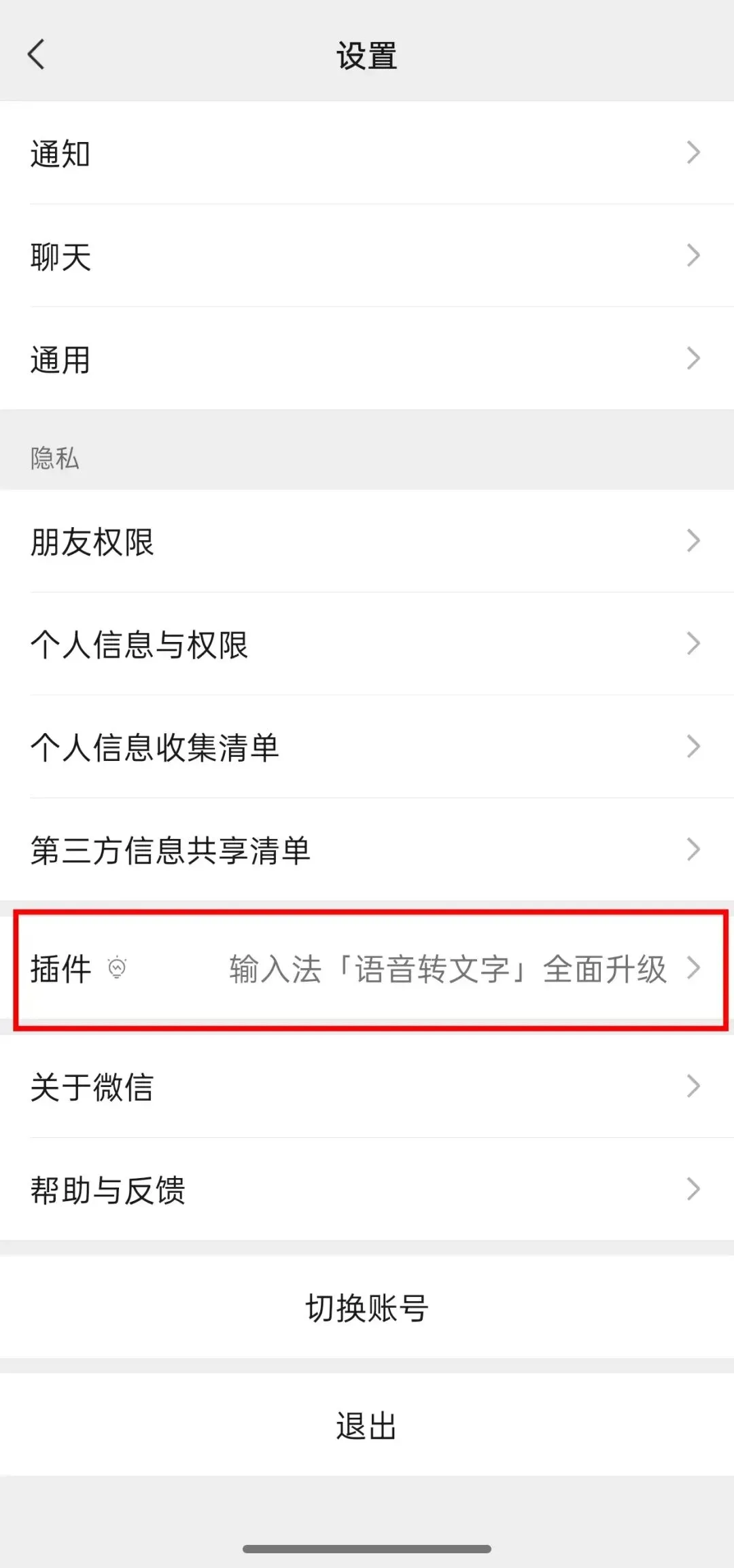 2.在设置页面中找到「插件」选项,点击进入微信插件中心;