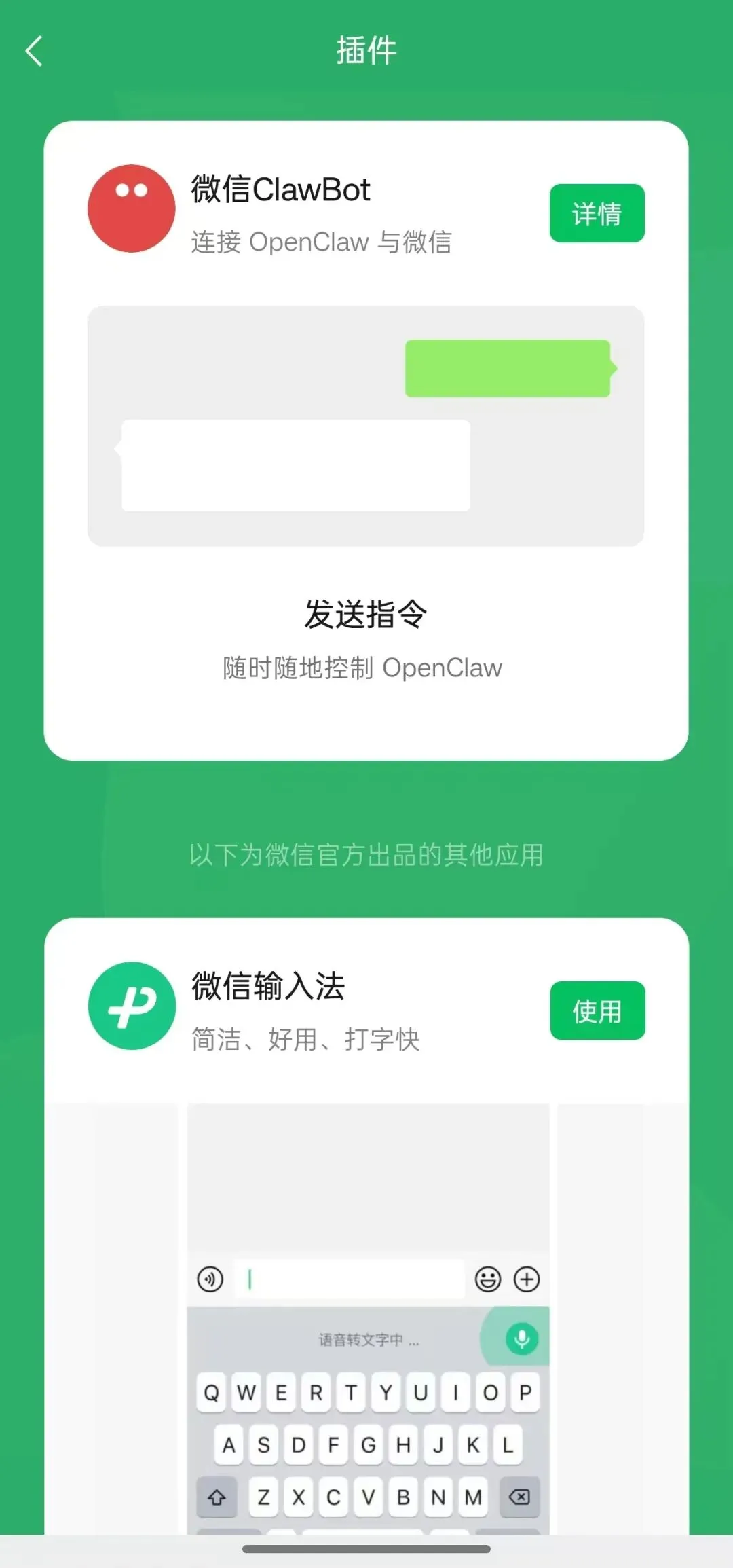 3. 插件中心内可直接看到「微信ClawBot」插件入口,点击进入插件详情页;