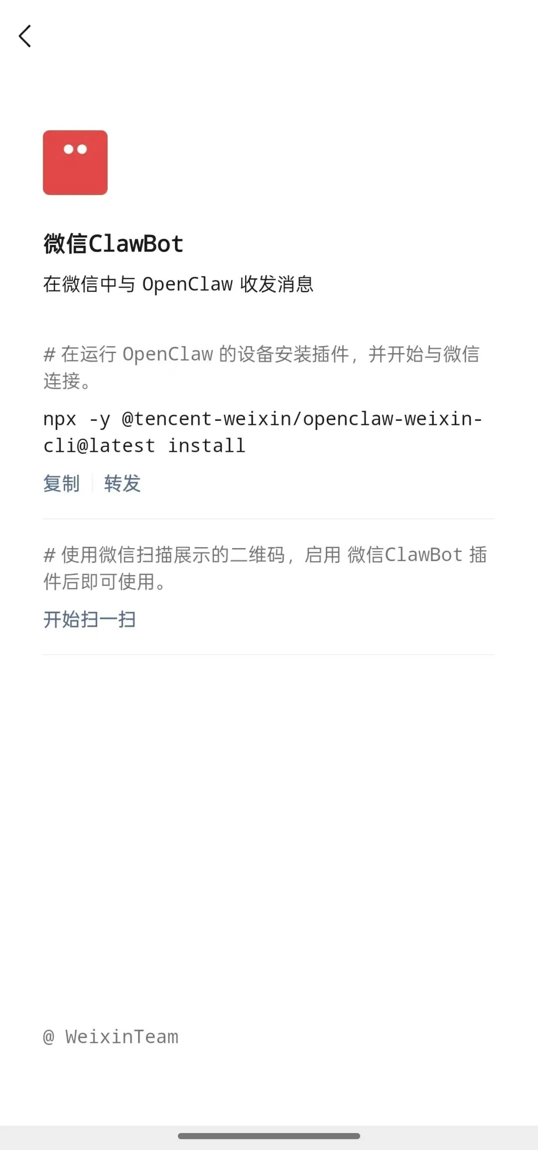 npx -y @tencent-weixin/openclaw-weixin-cli@latest install