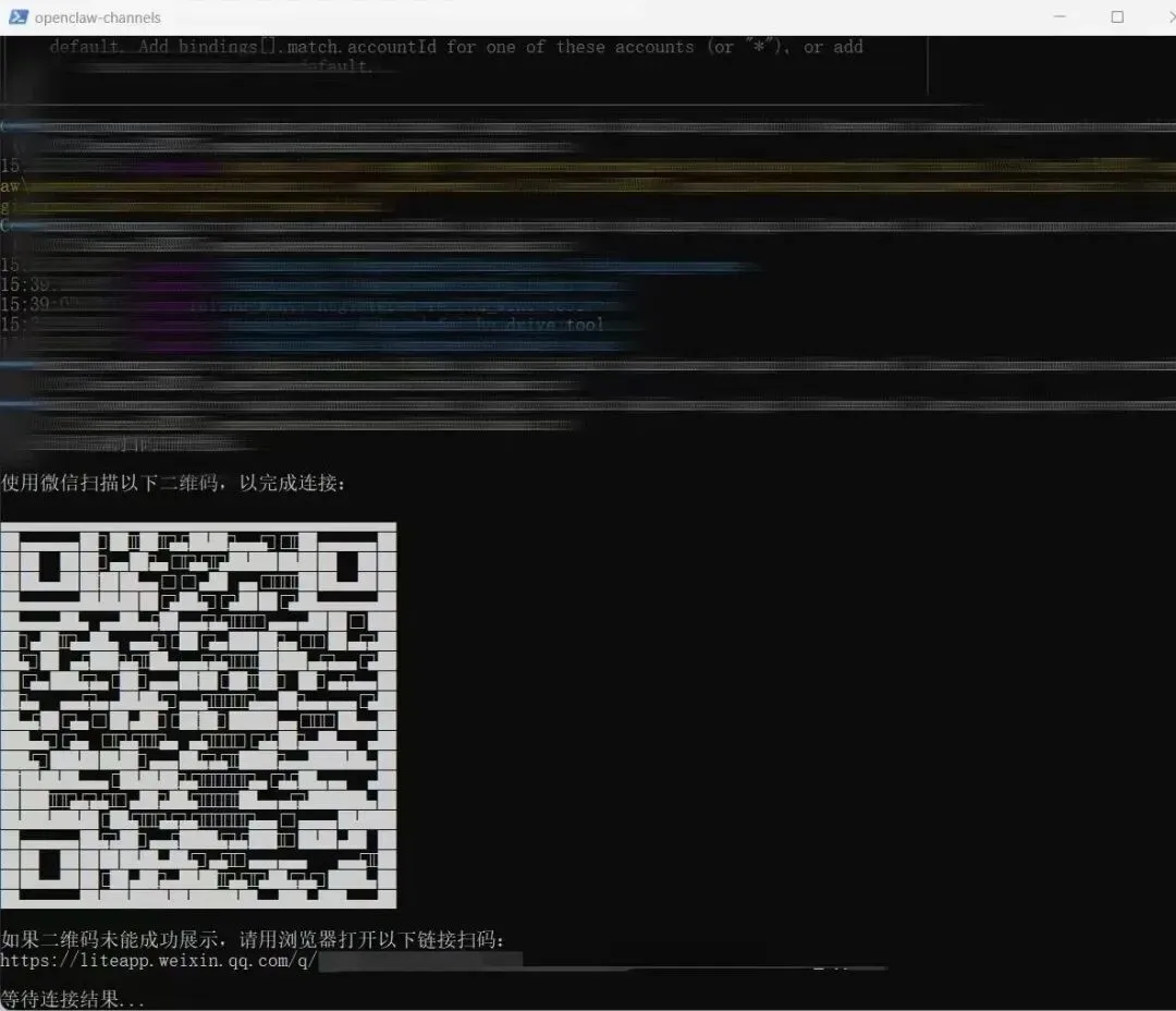 6. 打开已部署OpenClaw的电脑终端,粘贴并运行上述安装命令,终端将生成微信登录二维码,如果二维码没有正常生成,底部会提供二维码的链接,复制粘贴链接到浏览器打开即可;