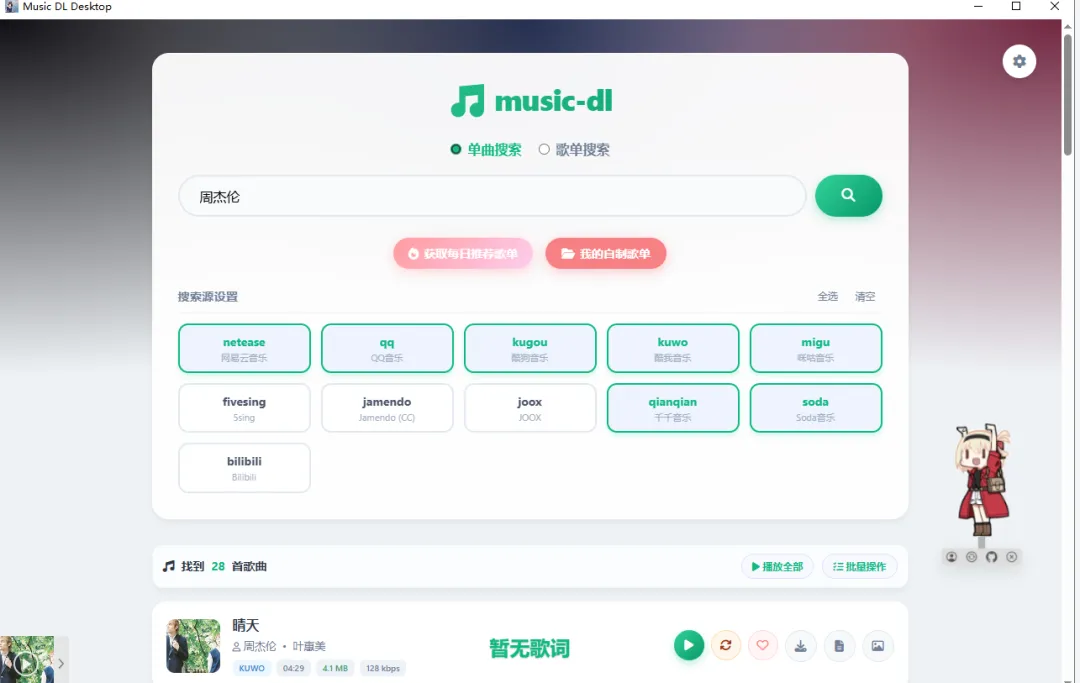 1. 一站式聚合,海量曲库全覆盖作为专业音乐聚合工具,它整合了全网海量音乐资源,不用在多个音乐APP之间来回切换,热门流行、小众金曲、影视原声、古风说唱各类曲风通通囊括,不管是最新热歌,还是经典老歌,基本都能搜到,彻底实现听歌自由,再也不用为了一首歌单独下软件、开会员。