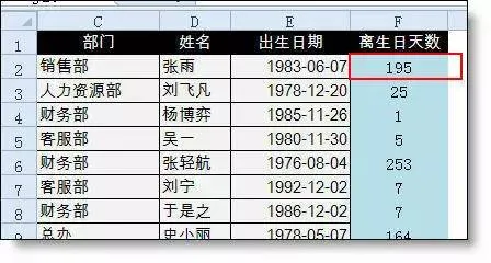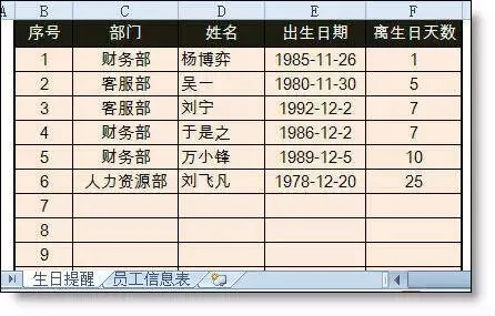 第1步:在员工信息表之后,增加一列,依据员工生日,自动计算距离生日还有多少天。