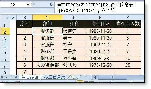 第3步:在生日提醒表的第一列中,输入一列序号,之后在使用vlookup函数,按照序号从员工信息表中查找相应员工的信息,并将公式复制至C:F列。