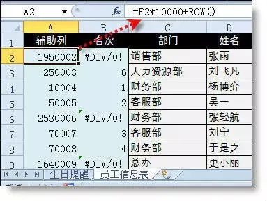 在A2单元格中输入公式:=F2*10000+ROW()