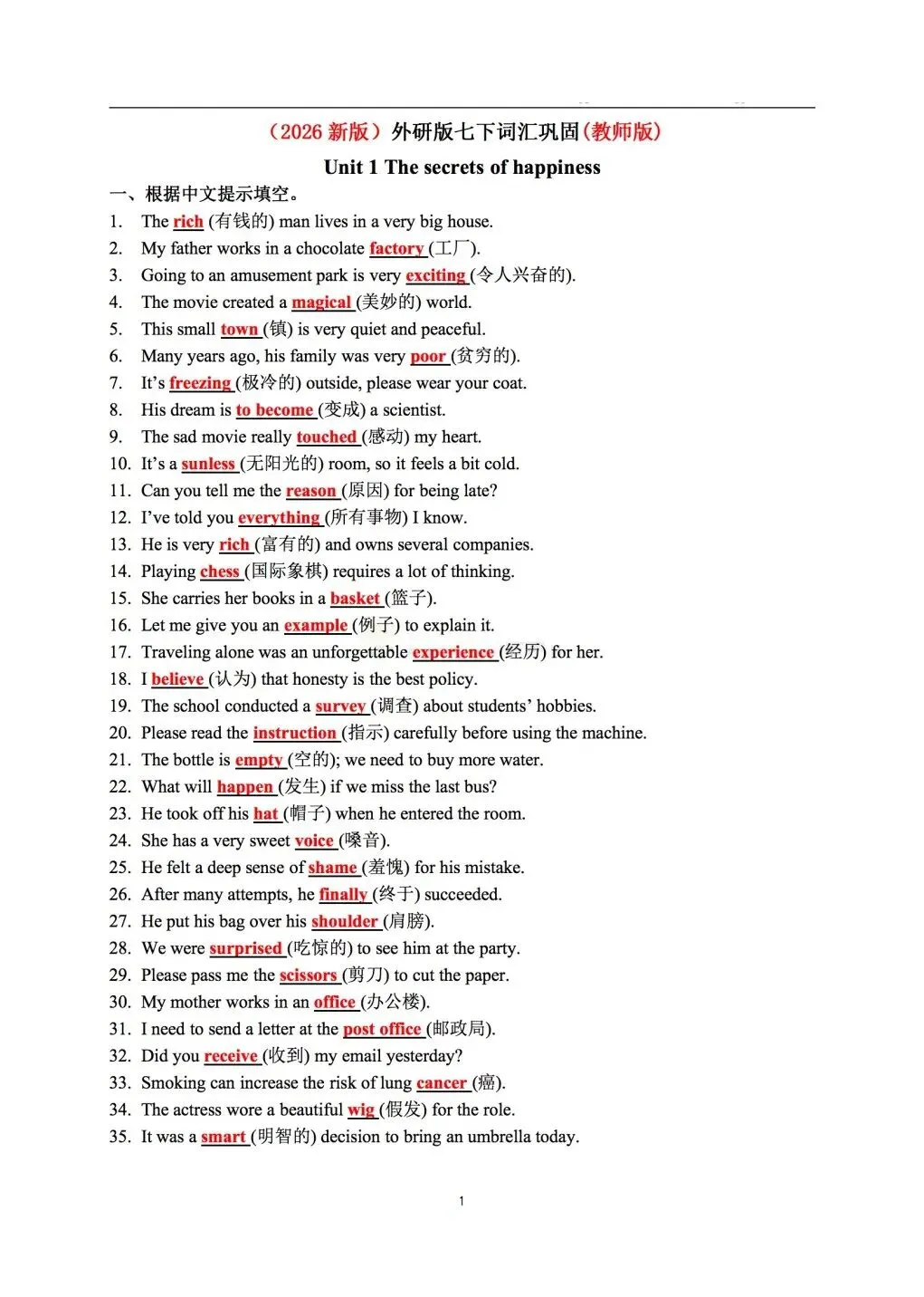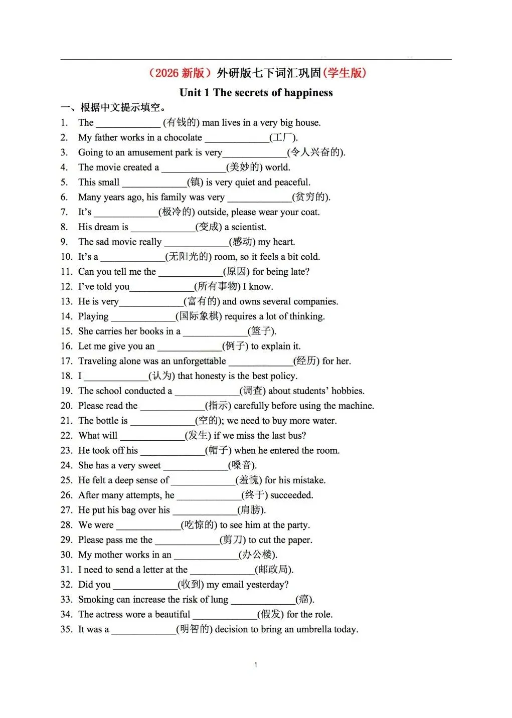 🌈今日给大家分享的学习资料是:2026年春新版七年级下册外研版英语《词汇巩固》专项训练(默写版+答案版),高清完整电子版可打印。这份学习资料包含词汇、语法、时态等核心考点,家长打印出来让孩子先默写词汇、再练语法填空,夯实课本基础、提升英语答题能力吧!🌸欢迎分享到家长群或班级群,帮助更多孩子高效学习吧~