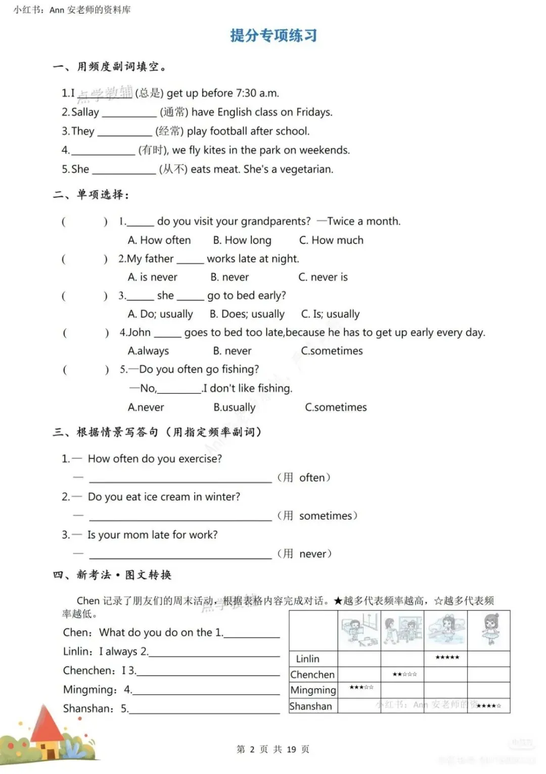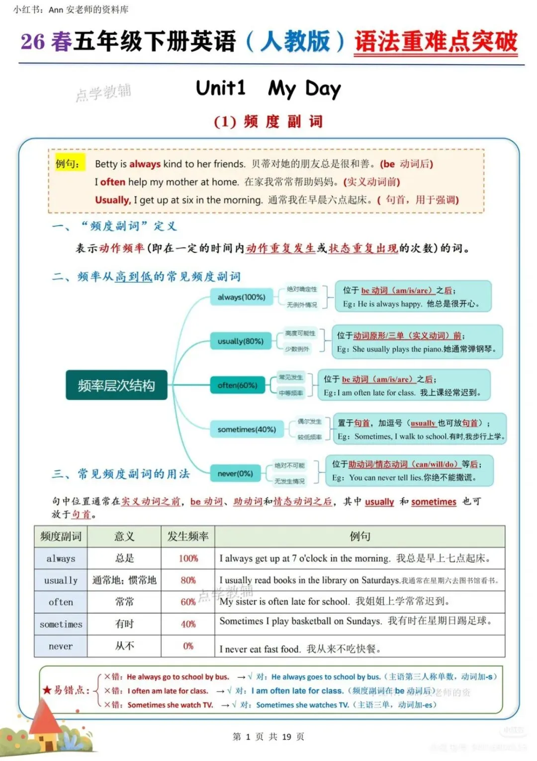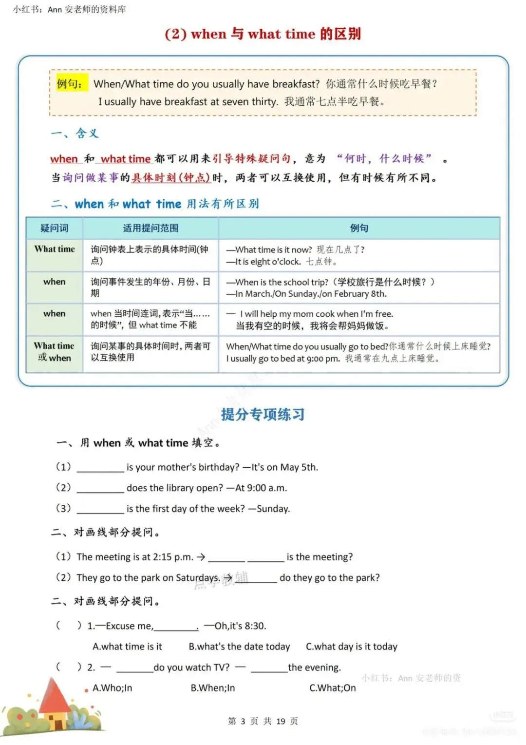 :系统梳理频率副词用法、when与what time区别、go/play/have/do等高频动词搭配等重难点。 - 排版清晰