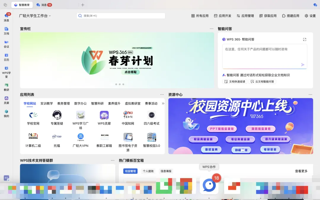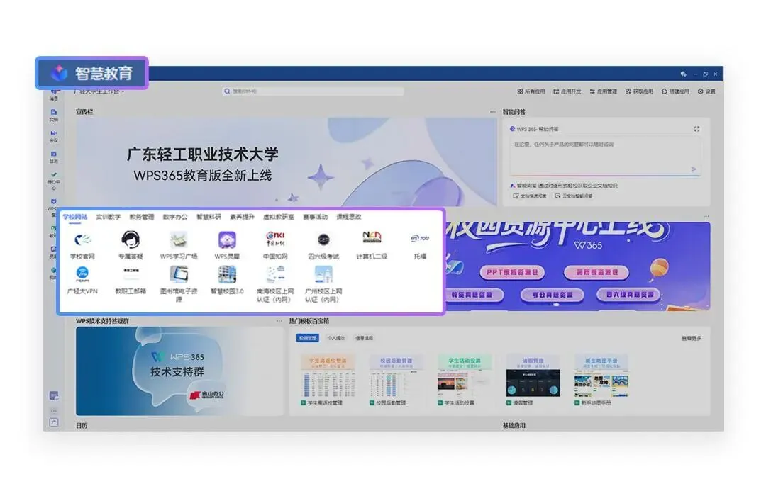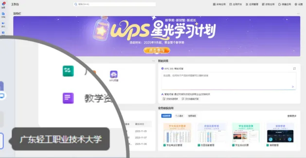 同时,广轻大还联合 WPS 365 重磅上线「校园资源中心」,12月31日前,全体师生通过智慧教育平台即可直达福利入口,免费解锁 WPS 超级会员 + 模板库会员双权益!