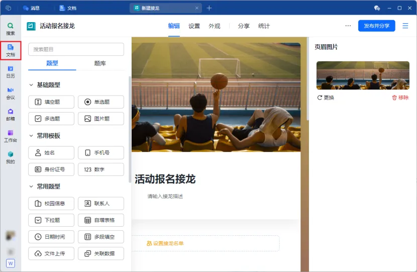快速创建表单:在 WPS 协作左侧【文档】入口,新建表单或多维表格,按需设置填报字段(如作业提交、个人信息、报名选项等)。