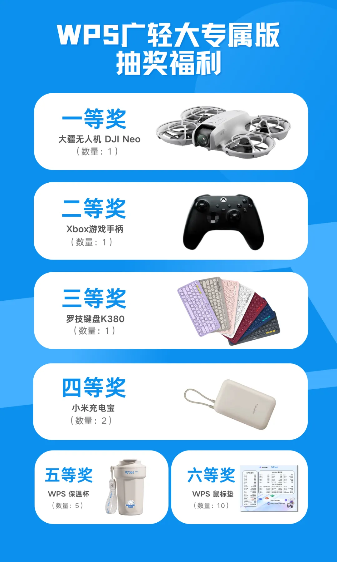 2.开奖后,中奖者将在WPS协作客户端“广轻大 WPS 福利权益中心” 、微信提醒中均收到中奖推送,请及时填写核销信息,WPS工作人员将联系您领取奖品。若因未填写个人信息而无法取得联系,则中奖无效;