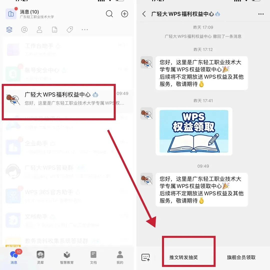 3.在消息列表找到 “广轻大 WPS 福利权益中心” 机器人,点击下方【推文转发并抽奖】,上传截图就能参与抽奖!