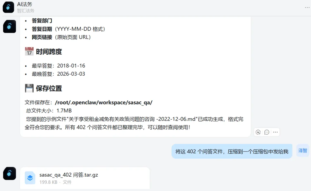 比较出乎意料的是,几句自然语言表述的需求,他完成的又快又好,并且给我总结了他完成的情况,比如总共多少篇问答,问答的时间跨度等。如果是在往常,可能要花很久时间来编写、调试python代码才能搞定,现在几句话交代清楚,AI自己就可以去执行这项工作,并且给我直接可以用的成果。