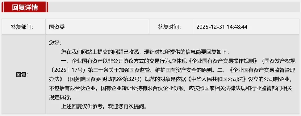 仅从文义来看,如果不是在产权交易机构公开进行的增资,似乎约定回购条款也不违规。2025年六七月份我们有个国企客户投资项目,就涉及这一点的合规性评价问题,当时也是这样评价的。但2025年12月31日国务院国资委的一个答复,就明确提出即便是非公开交易,也要遵循该原则,也即不能约定回购条款。