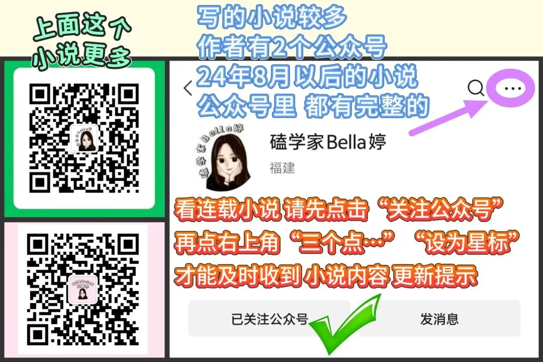 记得“关注+星标”公众号,不然可能收不到小说发文提醒,操作方式 上面图片有。没有“关注+星标”公众号,有些读者会收不到小说内容更新提示。
