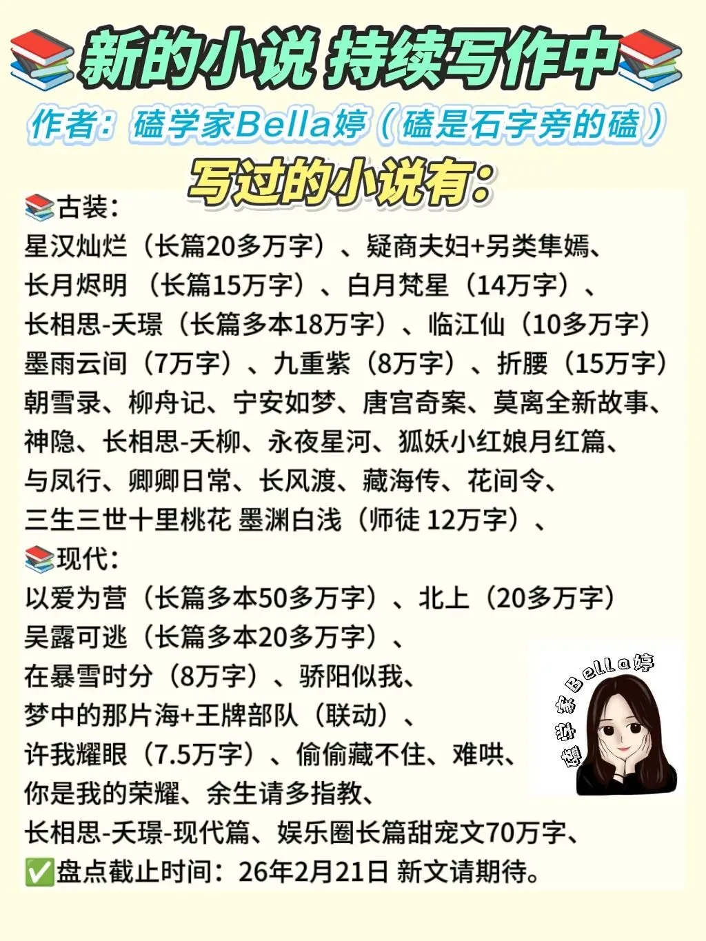 这里有:作者“磕学Bella婷”写的全部小说,各种汇总盘点,完结摘要盘点,等等。