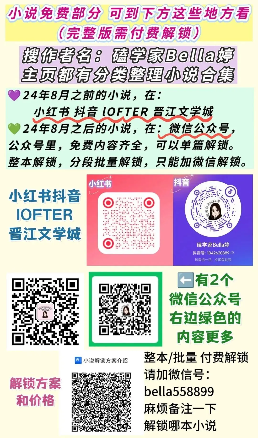 公众号,仅支持单篇解锁。如需,整本解锁,分段批量解锁,请加微信:bella558899(文末最下方有微信二维码)。海外读者,无法用公众号解锁的,可加微信解锁。完结于24年8月之前的小说(公众号里没有),如需解锁也请加微信。
