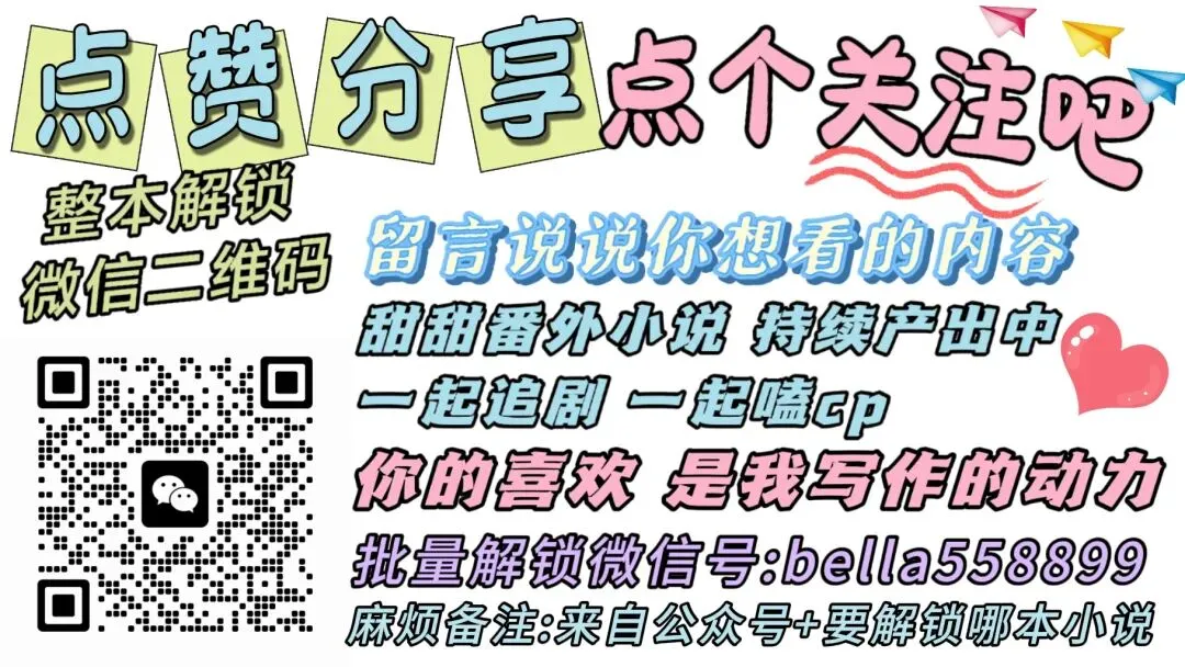 作者业余写文,时间有限,微信回消息慢。大家可以先看看,解锁方案介绍/价格,读者答疑,如需解锁,或有其他问题的,再加微信联系作者,谢谢你的喜欢。微信号:bella558899,备用号:phobe888,麻烦备注一下,来自公众号+要解锁哪本小说,或者有什么事情,这样作者能更快与你对接,给你发小说合集,解锁方案,节约沟通时间。业余写文,消息回复慢,请见谅。