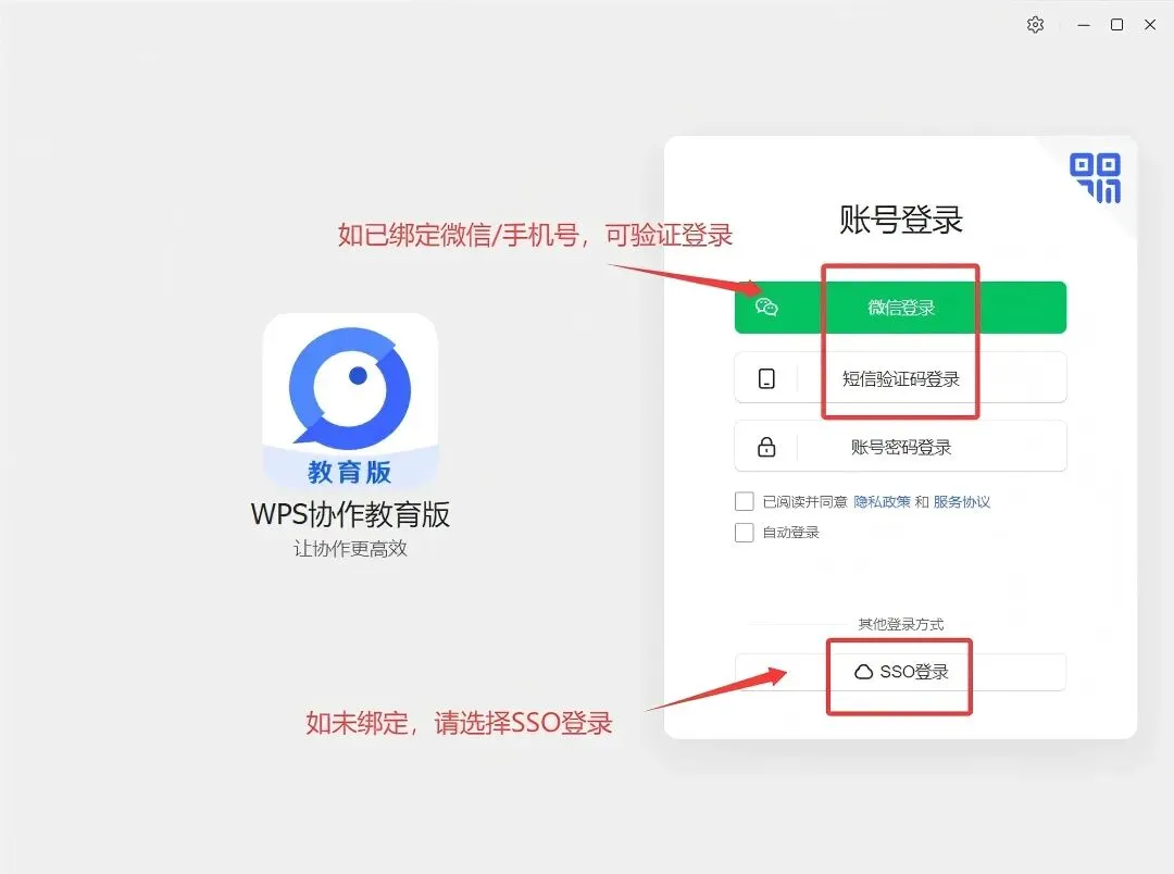 打开安装好的WPS客户端,首次登录选择右上角「账号登录」-「SSO登录」,输入学校代码njtech,点击「验证」,跳转到统一身份认证界面,输入学/工号和密码登录,后续可使用WPS协作手机端扫码登录。