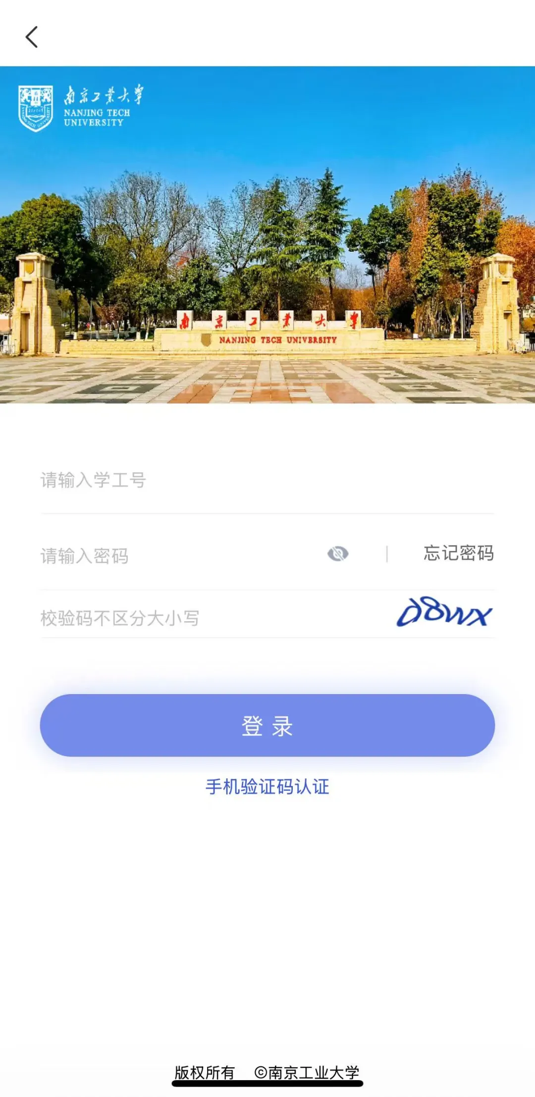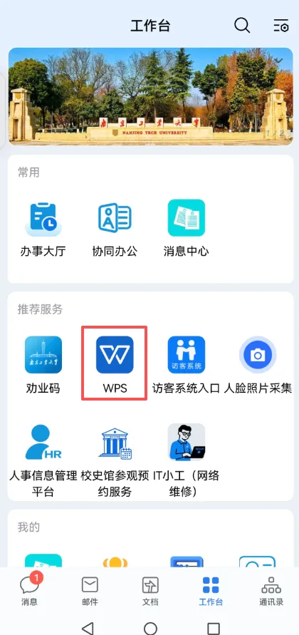 访问i.njtech.edu.cn,通过统一身份认证方式登录后,点击“智慧南工”,进入门户首页,点击应用中心