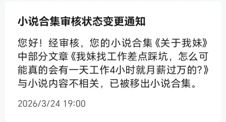 在收到这个通知之前,我都没有想过已经成功加入小说合集的文章还会被平台移出来。