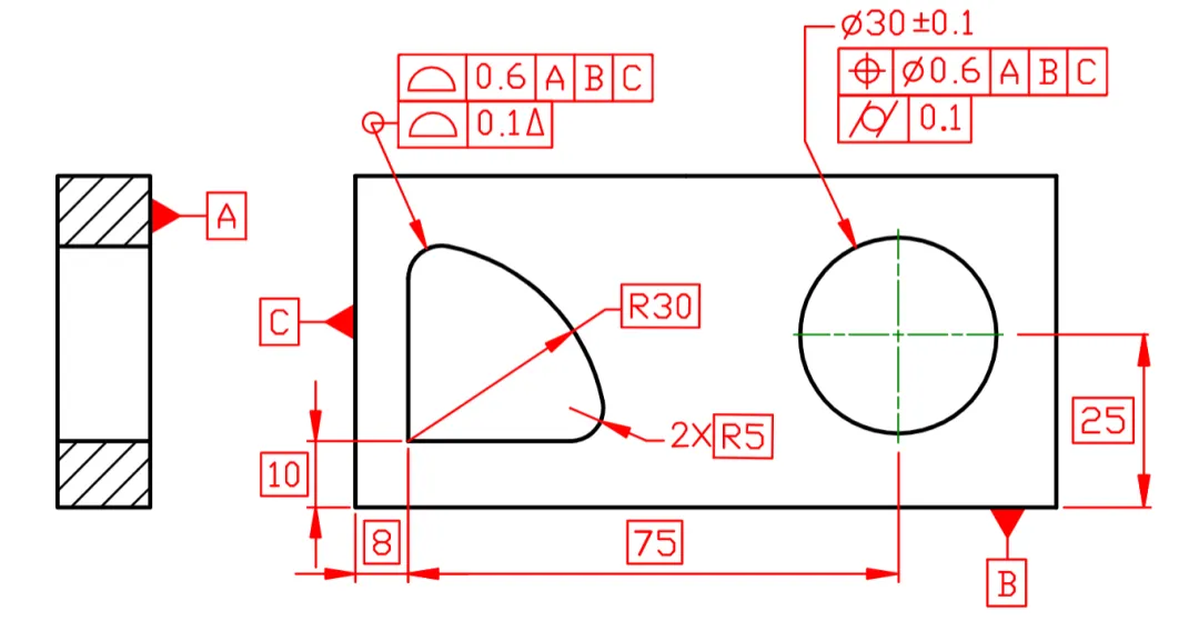 一块板件,上面有两个孔:右侧:标准圆柱孔;左侧:四分之一圆柱孔(复杂曲面),设计要求两个孔都相对于基准系 A|B|C 定位,但它们的形状控制方式不同。