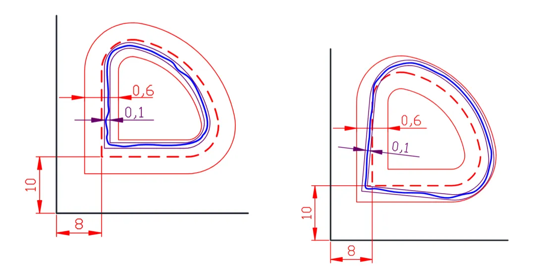 上图展示了两个动态公差带的示例,其公差带宽度较窄,T = 0.1 mm。这些动态公差带并非固定于某一位置,而是可以在一个更大的基准公差带(0.6 mm)范围内自由进行平移、旋转,甚至围绕理论轮廓进行均匀缩放。
