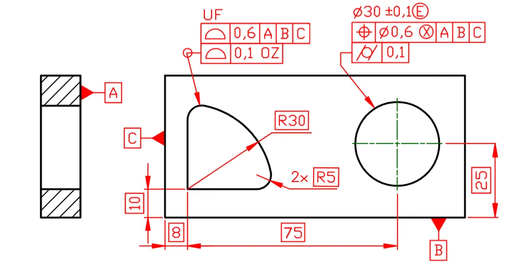 若仅标注一个相对于基准 A|B|C 的轮廓度公差 0.6 mm,则整个轮廓的形状与位置误差都被限制在同一个 0.6 mm 公差带内。若希望提升形状精度(例如控制在 0.1 mm),就不得不将整体轮廓度收紧至 0.1 mm。