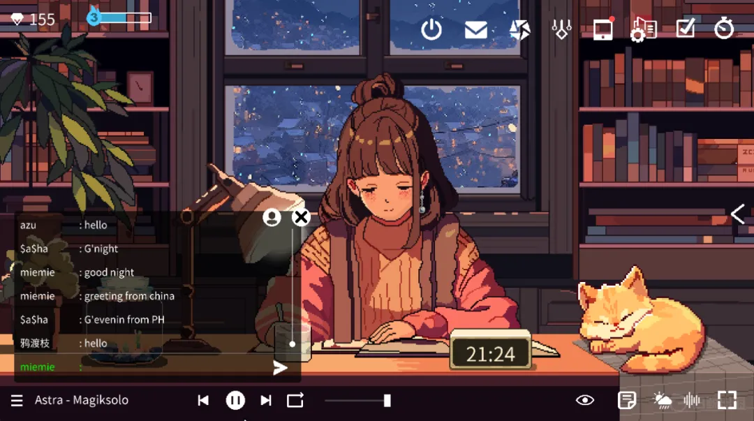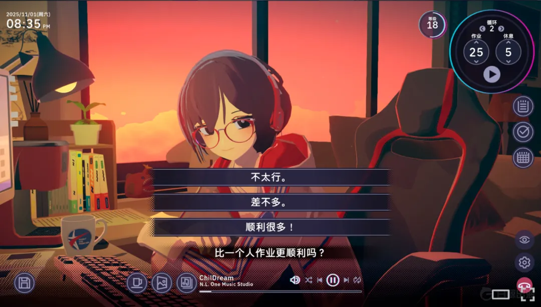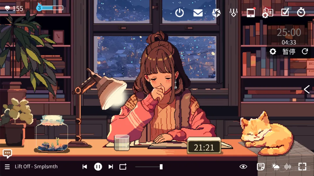 从《Virtual Cottage》到《放松时光:与你共享 Lo-Fi 故事》,它们在桌面端成立的原因,一是因为离真正的工作场景更近,写稿、查资料、读论文这些需要专注的任务都发生在电脑上,工具和任务都处在一个空间里;其次是相比偏高频、碎片化时间使用的手机 App,桌面软件能提供更多的常驻感。并且对于一款专注游戏来说,桌面端运行也意味着能提供一个更具沉浸感,承载更多美术复杂度的虚拟空间。