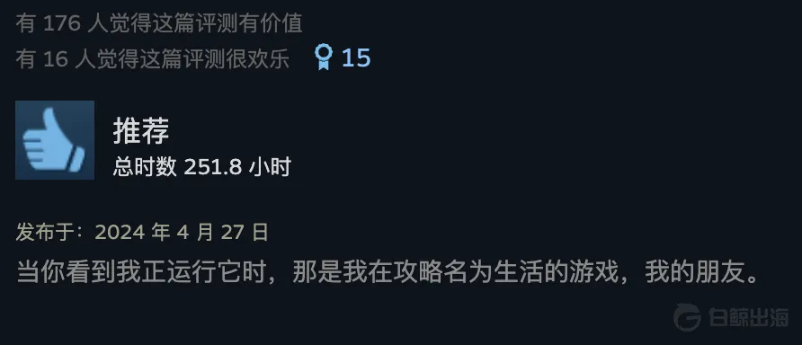 与此同时,Steam 也提供了一个相对特殊的土壤。在这里,这些产品通常被归到了名为 Cozy Game 的类别中,用户对于氛围、治愈这些元素的价值感知度明显更高,并且愿意为之付费。