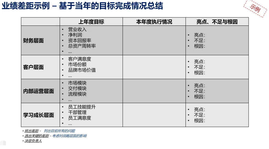 3、业绩差距示例:基于当年的目标完成情况总结,核心工具就是按BSC的财务层面+客户层面+内部流程层面+学习与成长层面四个维度列出上年度的目标,本年度执行情况,亮点不足和根因。