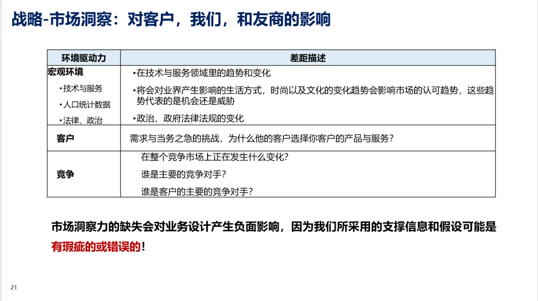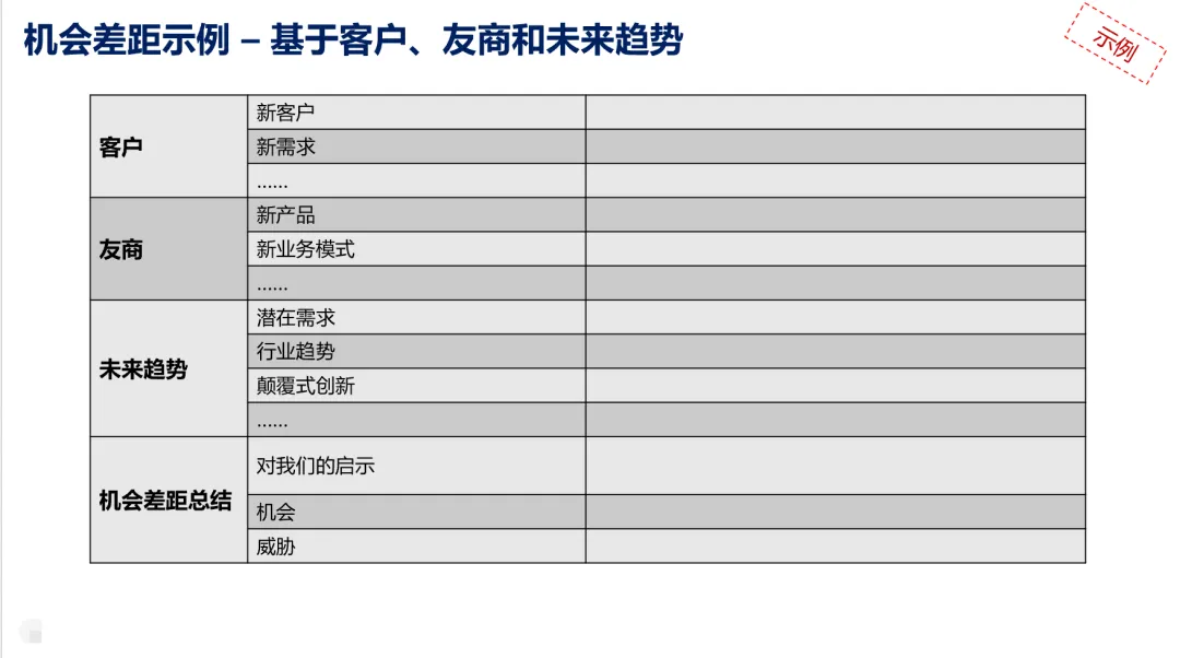机会差距:从客户、友商和未来趋势3个维度进行识别。输出就3点:对我们的启示,机会和威胁。