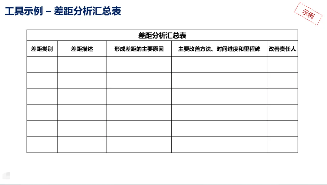 核心点是找到差距(列出所有的问题)+找到关键的差距(考虑对成本、战略层面的影响)+决定负责人。