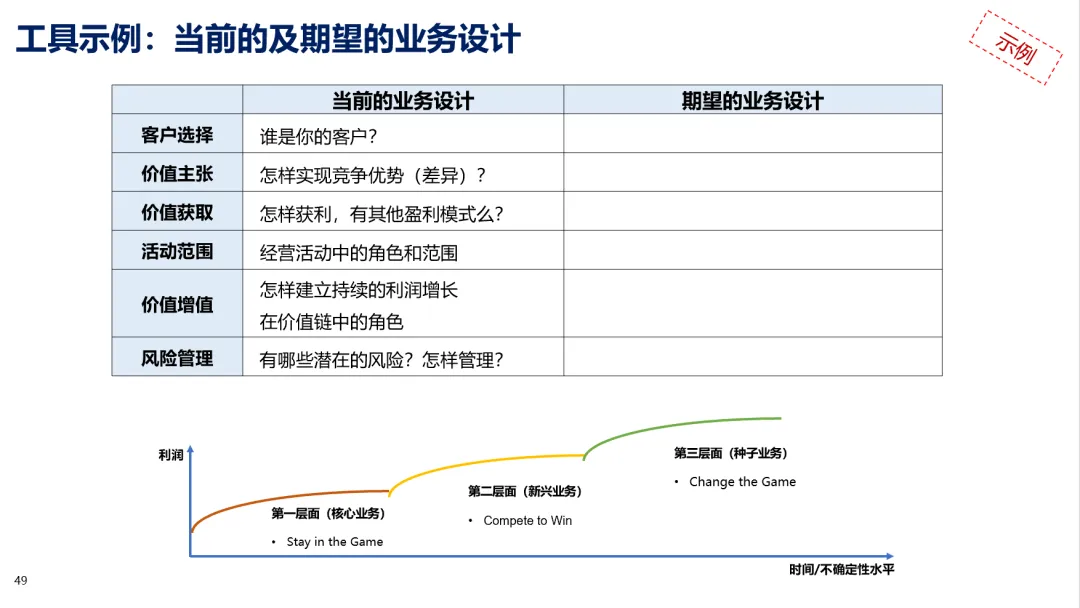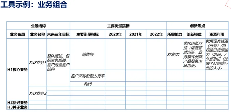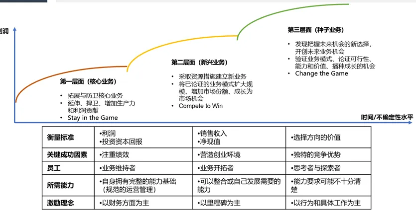 2、未来的业务组合:企业未来发展的核心问题是寻找第二层面业务并使其迅速发展成为第一层面,同时为未来埋下第三层面业务的种子。