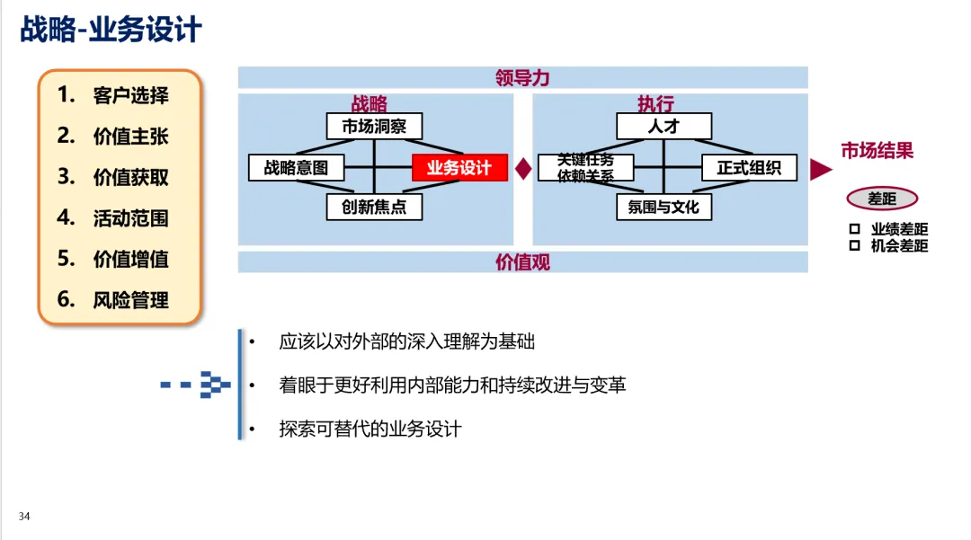 ③、业绩差距常常通过高效的执行来填补,不一定需要改变业务设计。填补一个机会差距需要有新的业务设计。