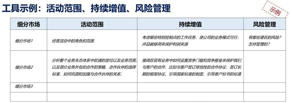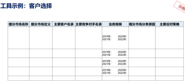 客户选择是驱动业务设计的关键。我们如何对客户进行细分/分类?不同客户类别对我们的特定需求是什么?我们选择什么样的客户? 工具方法: