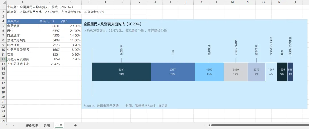 如图所示,为网上查找到的2025年全国居民人均消费支出构成数据。注意数据的排序,是根据金额从大到小的哈(这点很重要,数据排序,直接影响了图表中各类别的展示顺序)。