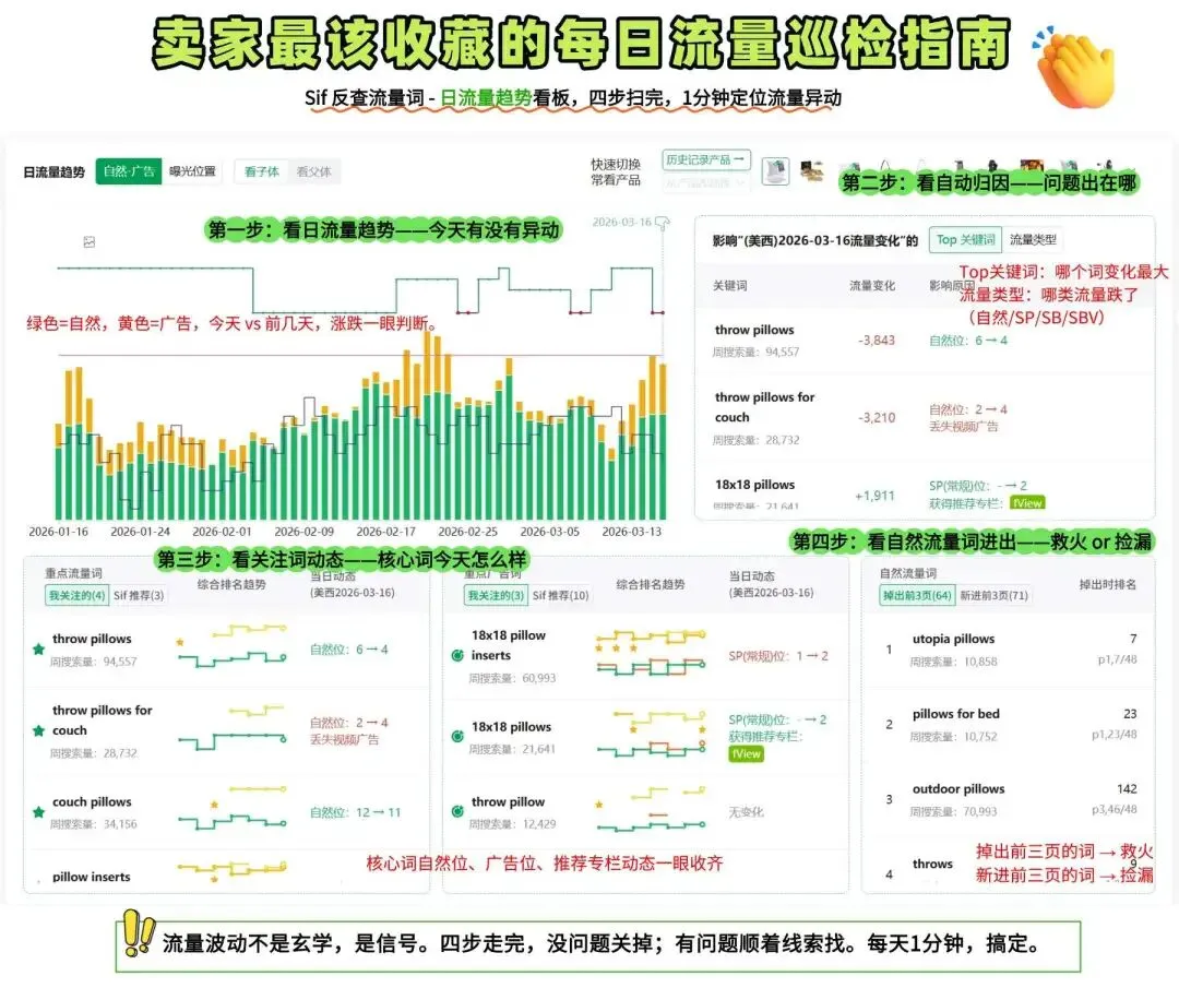 我现在的习惯是每天先打开 Sif 反查流量词,流量有没有异动、是哪类广告出了问题、核心词今天在不在位,一屏基本看完。真有问题再深挖,没问题直接关掉。每日流量看板和自动发现盲区,查竞品再也不用来回切后台、手动拉Excel了!