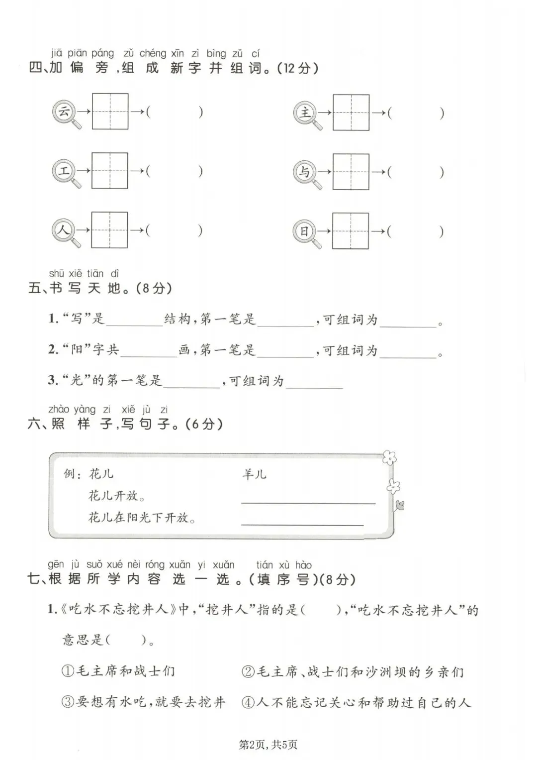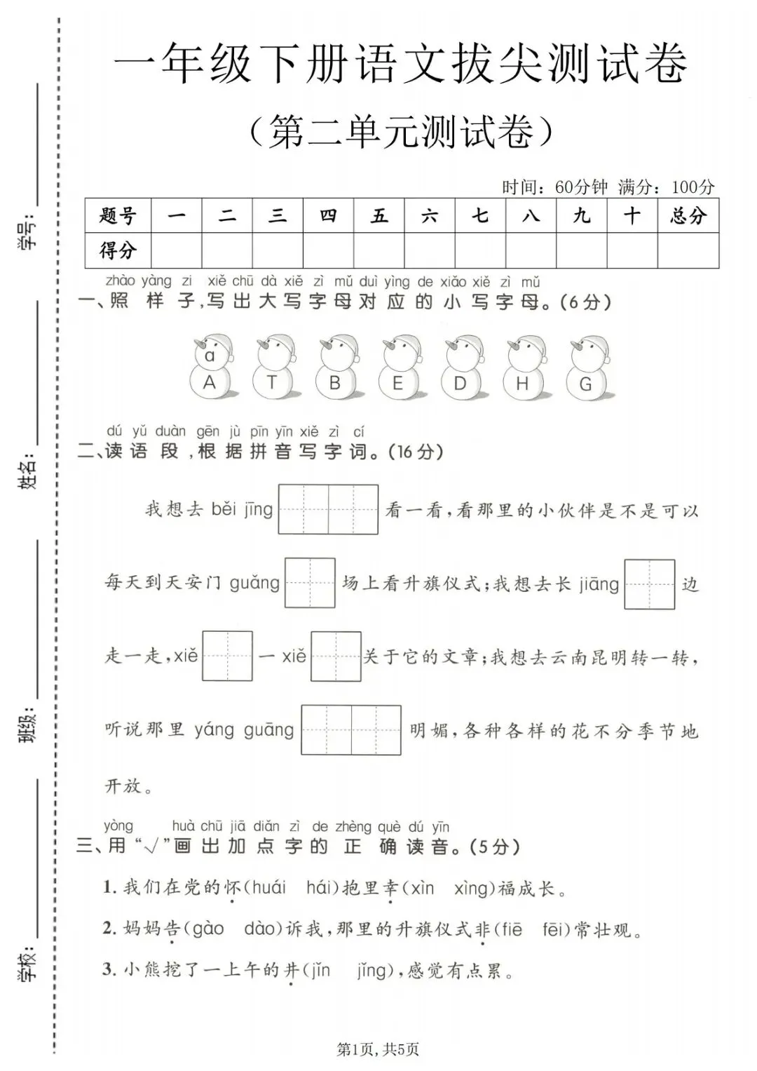 本试卷同步部编版一年级下册语文第二单元教学内容,按照基础过关+能力提升+拔尖拓展三层梯度设计,贴合单元测试、期中期末拔高题型,侧重生字辨析、词语运用、句子训练、课内阅读与看图写话核心考点,难度适中偏上,适合学有余力的学生冲刺满分,可直接打印使用,是一年级第二单元复习巩固、拔尖提分的专用测试卷资料。