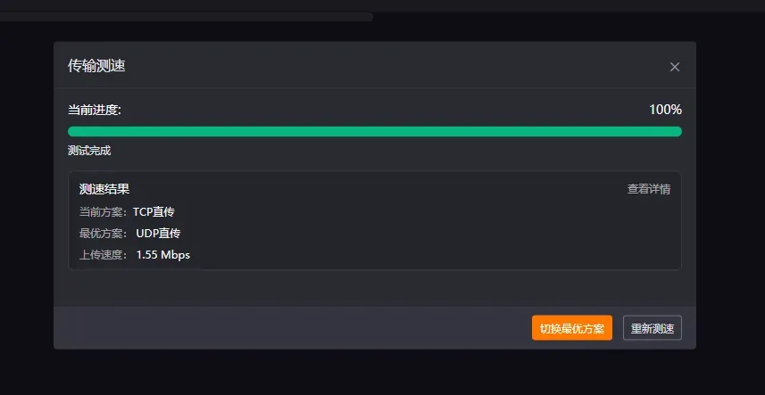 当任务上传或下载速度异常时,只需选中任务并右键点击-传输测速,即可测试不同传输策略到目标农场的速度,且自动推荐最优方案。
